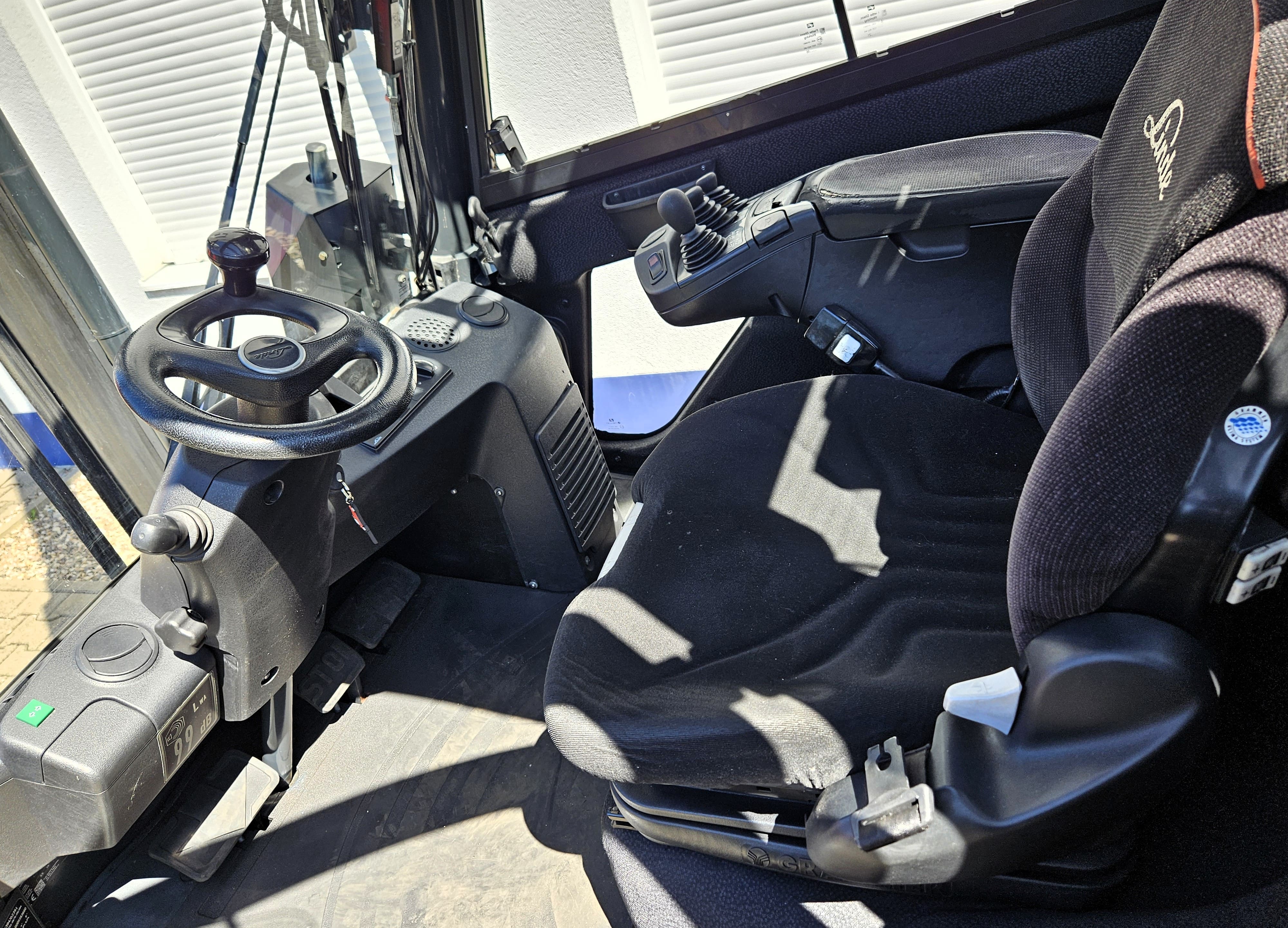 Vollkabine mit Klima-Anlage, 4-Zylinder Motor, Triplex-Mast mit Vollfreihub, 3. Ventil, 4. Ventil, Zwei-Pedal, gute Reifen, Gabellänge 1.200mm, entsprechende Anbaugeräte wie Seitenschieber, Zinkenverstellgerät, Drehgerät usw. auf Anfrage